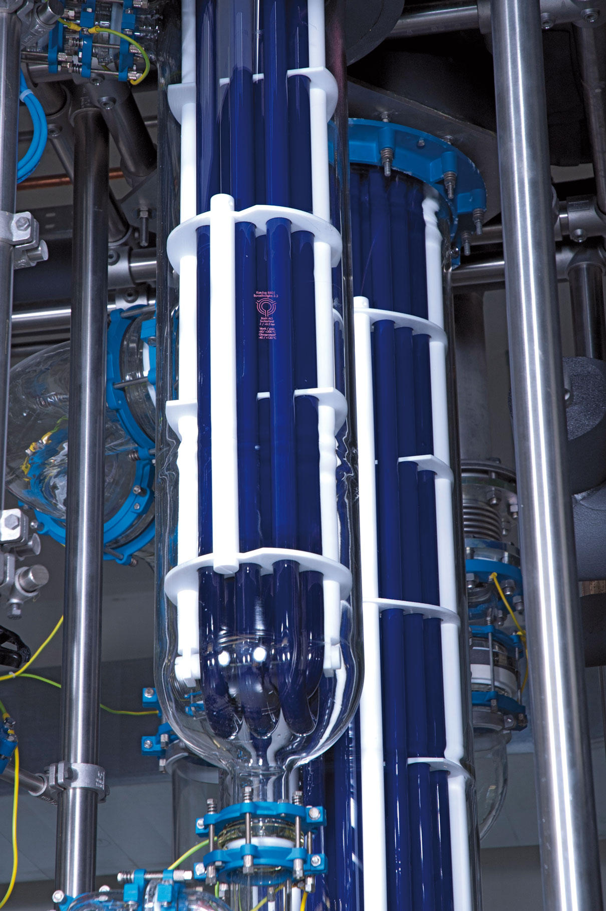 Glass-lined heat exchangers from THALETEC are always individually tailored and structurally designed to the demands of the process. Fig. 5 for example, shows a heat exchanger fitted in a plant in a vertical arrangement. Besides the tube bundle the double wall also contributes to the thermal transfer.