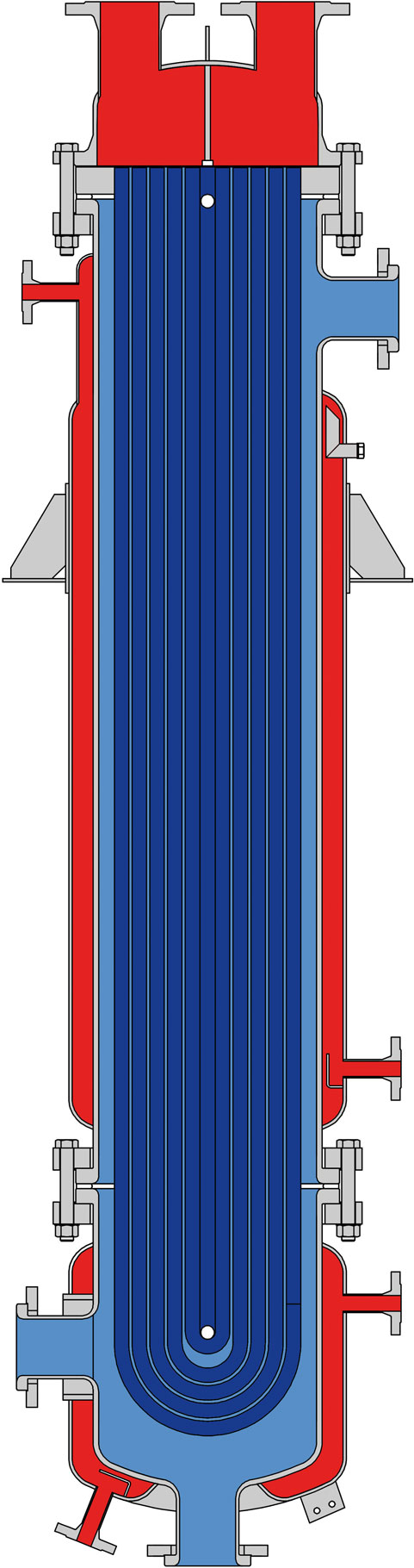 With regard to the length of the heat exchanger there are no limits in theory. The length of the tube bundle can be up to 4,500 mm, if required. The nominal diameter of the heat exchanger can be designed up to DN 600 in size.