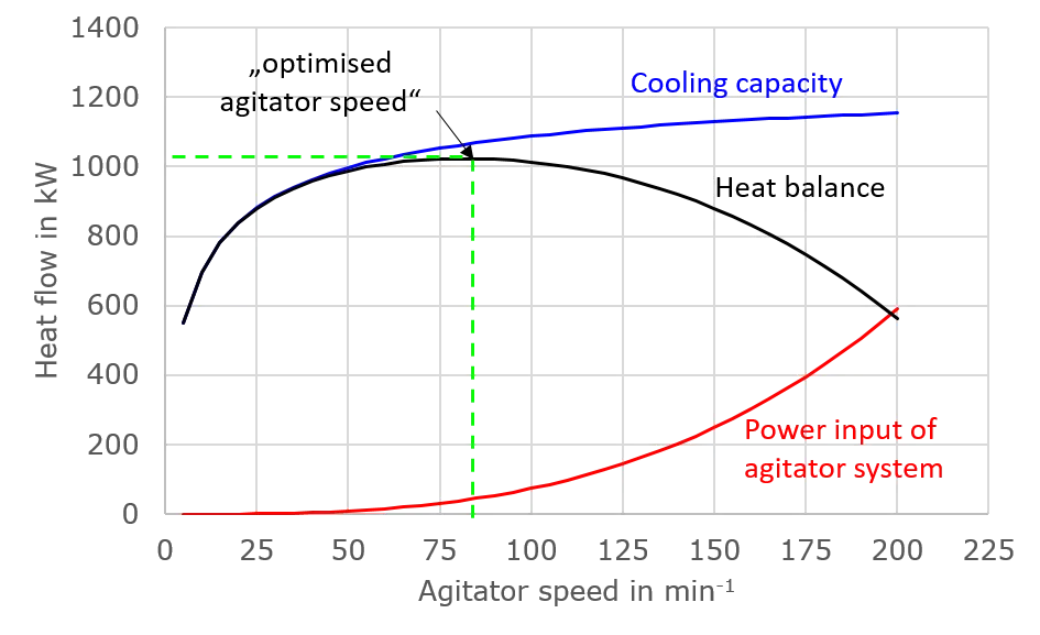 As described, in addition to the heat transport via the service media, a further power input (heat input) takes place via the agitator system. In the case of cooling via the service media, both aspects have an opposite effect. Both the cooling via the service media and the power input via the agitator system are speed-dependent and a maximum heat flow that can be dissipated is set as a function of the agitator speed - the optimised agitator speed.
