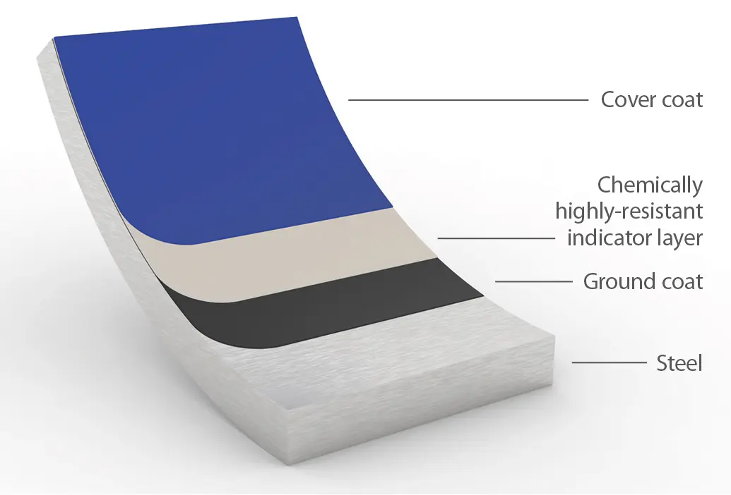 To increase the operational safety of components glass lined with THALETEC ALKASIST and to detect critical glass lining removal early, THALETEC ALKASIST is made in a multilayer process with an embedded, chemically highly-resistant indicator layer. If glass lining is removed during use, the early reaching of end of life can be easily detected visually.