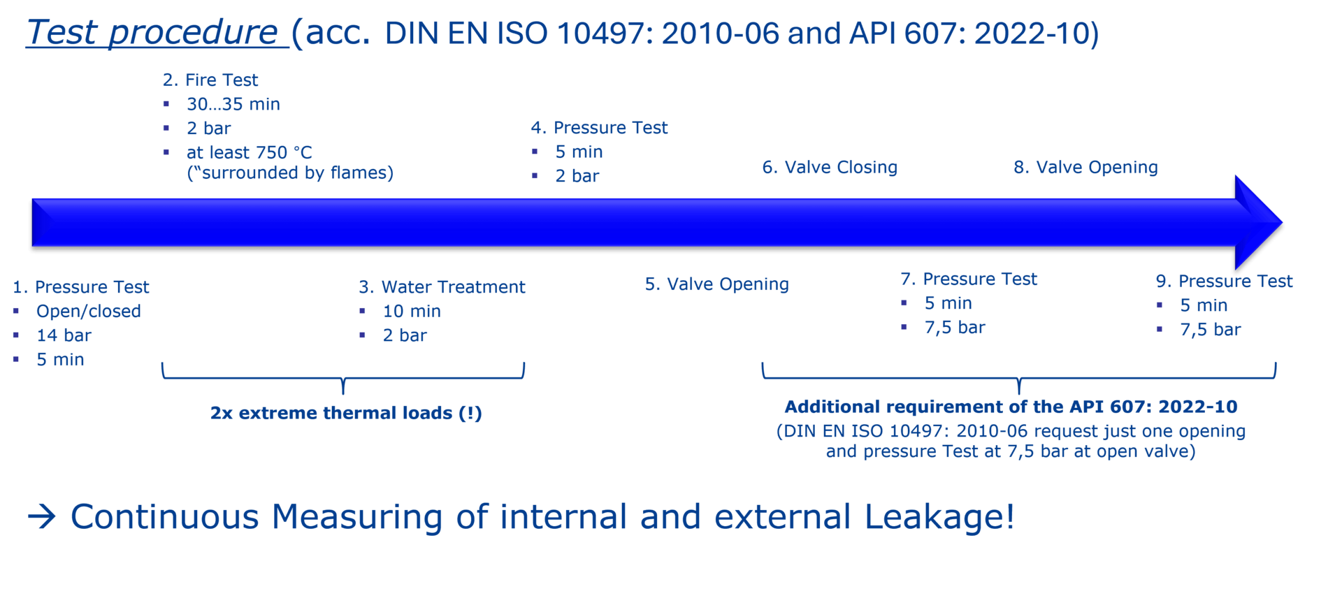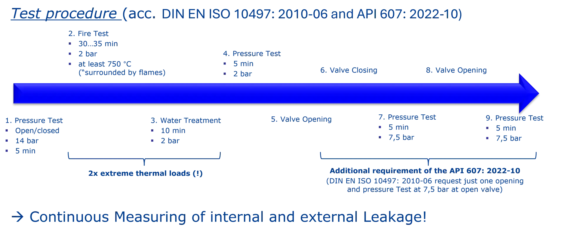 In Abhängigkeit der angestrebten Druckstufe, bspw. PN10, sind strenge innere und äußere Leckagen während des gesamten Messzyklus einzuhalten. Beginnend mit einer Dichtheitsprüfung bei 14 bar für 5 min wird das Bodenauslaufventil vor der Brandsimulation getestet. Ist die Dichtheitsprüfung bestanden, wird das Feuer gezündet, sodass Thermoelemente und Kalorimeter an definierten Ventilstellen in kurzer Zeit mindestens 750 °C erreichen müssen. Dabei muss das Bodenauslaufventil von der „Flamme umhüllt“ sein. Dieser Zustand ist mindestens 30 min zu halten. Anschließend wird ein Löschen mit Wasser simuliert und das Bodenauslaufventil muss innerhalb von 10 min wieder die Umgebungstemperatur erreichen (Temperatursturz) – die zweite extreme thermische Belastung! Während des Brandes und Löschens liegt behälterseitig immer ein Druck von 2 bar an. Nach der Simulation des Brandes und des simulierten Feuerwehreinsatzes erfolgt ein weiterer Drucktest für 5 min bei 2 bar, um etwaige innere und äußere Leckage zu ermitteln.