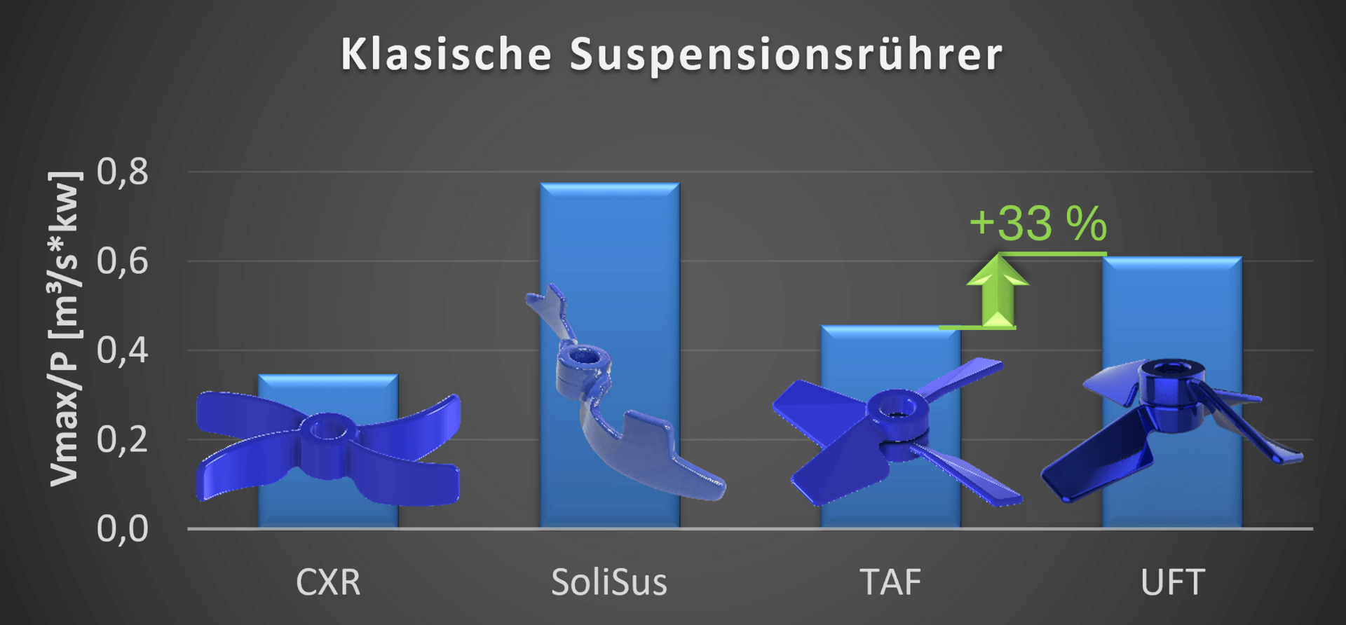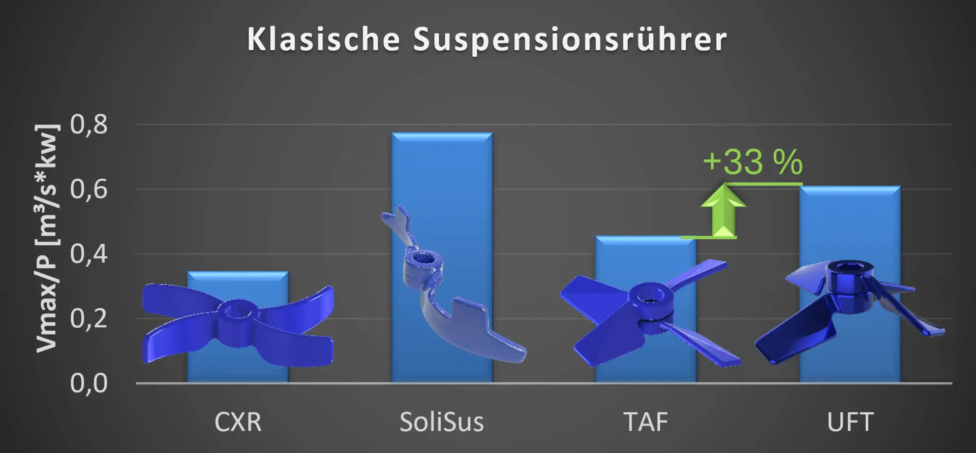 - +33 % Volumenstrom gegenüber klassischen Hydrofoil-Rührern, wie der TAF (K172), bei gleichem Rührerdurchmesser