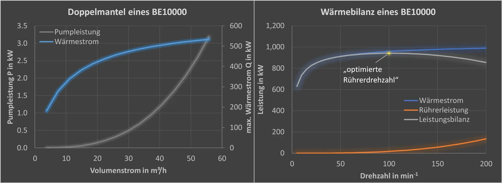 Da Emaille physikalisch gesehen ein schlechter Wärmeleiter ist, hängt der Wärmedurchgangskoeffizient (k-Wert) stark von der Emailleschichtdicke ab. Umso wichtiger ist die Einstellung der weiteren Einflussgrößen! Ein geeigneter Wärmeträger ist zu wählen und günstige Strömungsverhältnisse sind innen und außen am Innenkessel zu realisieren, um beidseitig einen hohen Wärmeübergangskoeffizient (α) zu erzielen. Dies wird an der Innenseite mittels Rührer umgesetzt, die eine hohe Pump- bzw. Umwälzleistung aufweisen. Mehrstufige Rührsysteme unterstützen diesen Effekt. Dabei hängt der übertragbare Wärmestrom von der Rührerdrehzahl ab. Jedoch folgt der Wärmestrom in Abhängigkeit der Rührerdrehzahl einer Wurzelfunktion (Abbildung 3)! Dies bedeutet, dass ab einer bestimmten Drehzahl kein nennenswerter Zuwachs an übertragbarer Wärmeleistung zu erzielen ist. Im Gegenteil, da die eingebrachte Leistung der Rührtechnik direkt in Wärme im Produkt umgewandelt wird, ist eine weitere Drehzahlsteigerung bei Kühlprozessen kontraproduktiv (die Drehzahl fließt zur 3-ten Potenz in die Rührleistung ein!). Dieser Extrempunkt der Wärmebilanz wird als „optimierte Rührerdrehzahl“ bezeichnet (Abbildung 3).