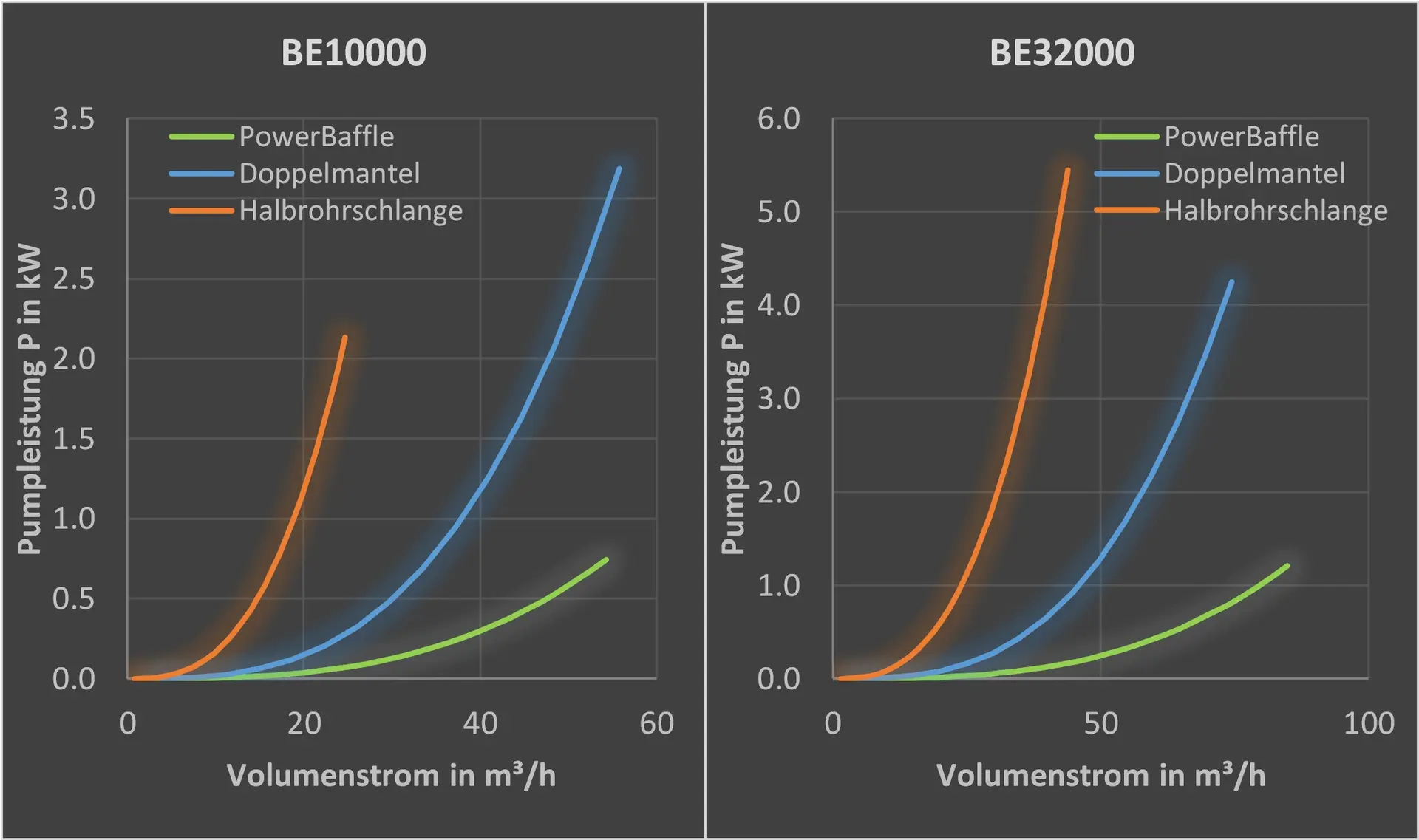 Weitere Betriebskosten und ebenso CO2-Emissionen resultieren aus der Bereitstellung der Servicemedien über Pumpen. Meist sind große Volumenströme für den Betrieb der Reaktoren notwendig. Um dennoch die Pumpleistung auf einem niedrigen Niveau zu halten, sind hydraulische Druckverluste in einer Anlage zu minimieren. Rohrleitungssysteme mit großem Durchmesser sind zu bevorzugen und auch die Auswahl der Heiz- bzw. Kühlräume der Reaktoren hat einen entscheidenden Einfluss. Halbrohrschlangen weisen aufgrund ihrer langen Spiralform und des sich bildenden Sekundärwirbels den größten Druckverlust im Vergleich auf. Der größte Druckabfall in Doppelmänteln resultiert an den parallelgeschalteten Strömungsdüsen. Ein PowerBaffle weist dagegen die niedrigsten Betriebs- und Energiekosten auf. Dies ist auch sinnfällig, da bei einem PowerBaffle mehrere parallelgeschaltete Rohre einen geringen Druckverlust generieren (Abbildung 5).