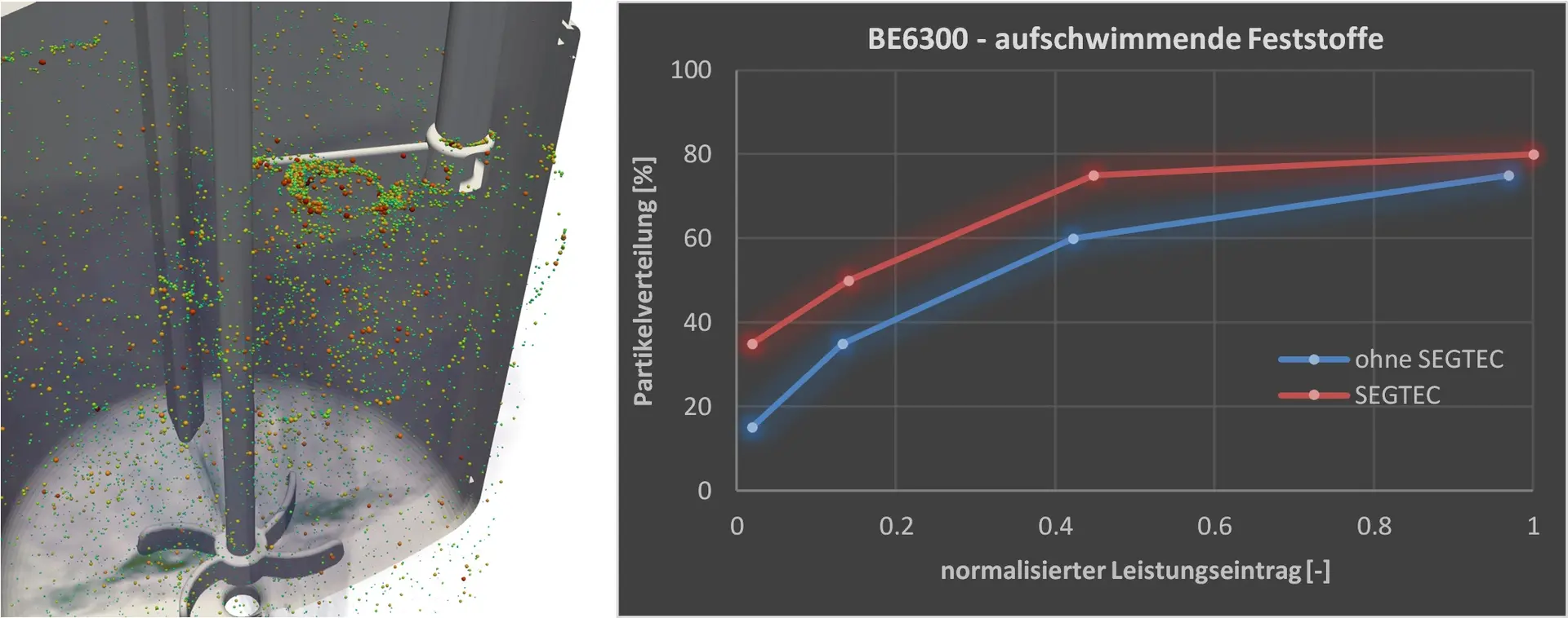 Ein oft vernachlässigtes Thema ist neben einem prozessgeeigneten Rührorgan das eingesetzte Stromstörersystem! Stromstörer dienen im Allgemeinen zur Steigerung des spezifischen Leistungseintrages (kW/m³) und zur Verkürzung von Mischzeiten, da ein reiner tangentialer Produktfluss im Reaktor gestört/umgelenkt, die Turbulenz erhöht und eine Trombenbildung reduziert werden. Neben diesen Haupteffekten kann ein Stromstörer wiederum gezielt prozessunterstützend eingesetzt werden. Prozessabhängig ermöglichen Stromstörer das Einleiten von Fluiden (Gase/Flüssigkeiten) an geeigneter Position, wie turbinennah (relevant beim Begasen) oder direkt hinter dem Stromstörer (effektive Vermischung). Spezielle Stromstörer, wie das SEGTEC (Abbildung 1), bewirken zudem eine signifikante Verbesserung einer Oberflächenbegasung oder das Einziehen von aufschwimmenden Flüssigkeiten oder Feststoffen. Insbesondere wird ein exzentrischer Wirbel im Reaktor erzeugt, der die Gase oder aufschwimmenden Stoffe gezielt zur oberen Stufe des Rührsystems führt. Die eingezogenen Stoffe werden deutlich effektiver und feiner im Reaktorraum verteilt, sodass schnelle Reaktionen stattfinden. Kürzere Prozesszeiten oder alternativ reduzierte Drehzahlen sparen Energie (Abbildung 1).