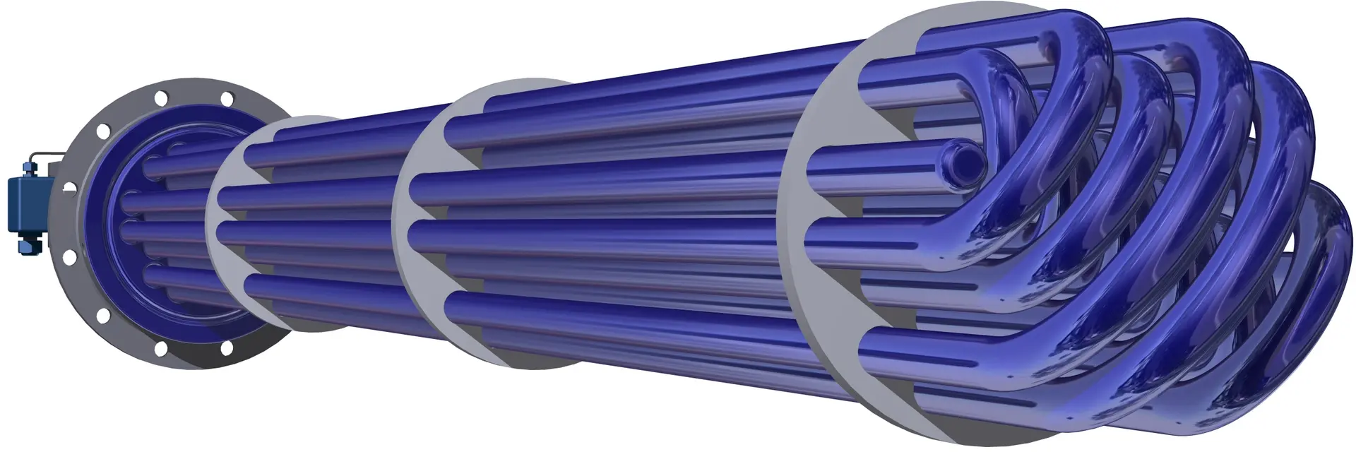 Stromstörer können weiterhin zur Prozessüberwachung (bspw. Temperaturmessung, Probeentnahme etc.) eingesetzt werden. Darüber hinaus bietet THALETEC weltweit als einziger Hersteller einen emaillierten Rohrbündelwärmetauscher (einen sog. PowerBaffle) an, der die Funktionen eines Stromstörers, einer Temperatursonde und die eines im Rührbehälter eingebauten Wärmetauschers realisiert. Kürzere Prozesszeiten oder ein reduziertes Temperaturniveau zwischen Produkt und Servicemedium (damit weniger Umgebungsverluste) sparen spürbar Energie (Abbildung 2)! Ebenso wird die Anlagensicherheit aufgrund der höheren verfügbaren Wärmeleistung bei exothermen Reaktionen erhöht. Das PowerBaffle kann zudem zur Trennung von Kühl- und Heizkreisläufen dienen.