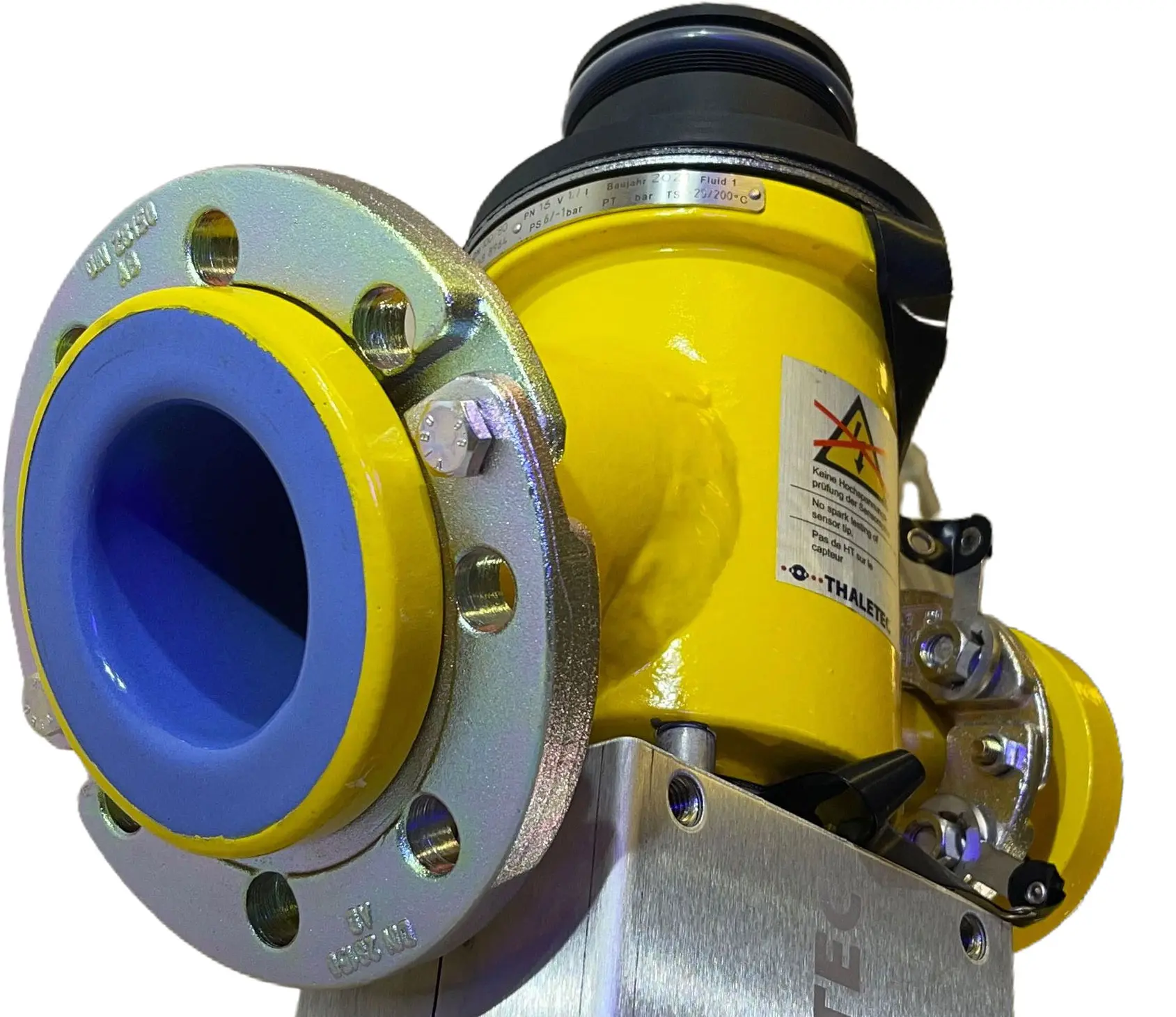 Weiterhin neu ist, dass THALETEC Bodenauslaufventile mit elektrisch ableitfähiger Emaillierung über einen nunmehr tangential angeordneten seitlichen Spülstutzen verfügen können. Untersuchungen haben ergeben, dass die tangentiale Anordnung des Spülstutzens gegenüber der bisher üblichen radialen Anordnung Vorteile bezüglich der Reinigung des Ventilkörpers aufweist.