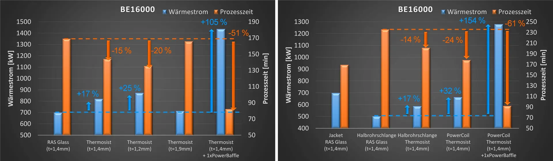 Die Wärmeleitfähigkeit des Emails stellt nur einen, wenn auch entscheidenden, Teil des Wärmedurchgangskoeffizienten des Verbundmaterials dar. Zur Veranschaulichung der Vorteile des THALETEC Thermosist sollen folgende Rechenbeispiele dienen, die auf einem emaillierten Reaktor (BE16000) basieren. Dabei werden Varianten des BE16000 mit Doppelmantel und Halbrohrschlange jeweils miteinander verglichen (Abbildung 2). Allen gemein ist derselbe Prozessschritt, welcher einen Kühlprozess von Wasser bei Nominalvolumen darstellt. Das Produkt wird dabei von 80 °C auf 30 °C mittels Kühlwasser (20 °C) abgekühlt. Ebenso ist die Rührtechnik in allen Fällen gleich. Variiert werden lediglich das verwendete Email und die Kühlräume.
