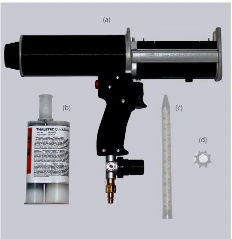 Mit Hilfe einer Druckluftbetriebenen Kartuschenpistole wird das in einer Doppelkartusche gelieferte THALETEC QuickShim in die Dichtungshülle eingespritzt.