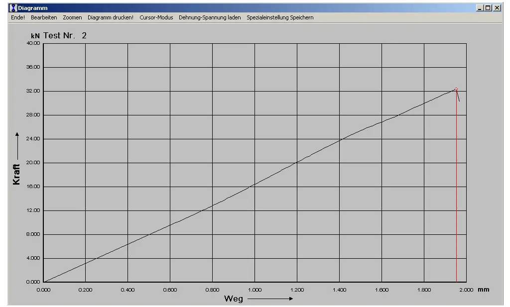 Abbildung 4 zeigt einen Screenshot des Kraft Weg Diagramms, welches bei der Durchführung des Versuchs aufgezeichnet wurde. Man erkennt dass sich das emaillierte Rohr zunächst um etwa 1,8 mm dehnt, ohne das es zu einer Beschädigung des Emails kommt, wenn die Zugkraft aufgebracht wird. Erst beim Erreichen einer Zugkraft von etwa 32 KN (das sind 3,2 Tonnen!), löst sich das Rohr.