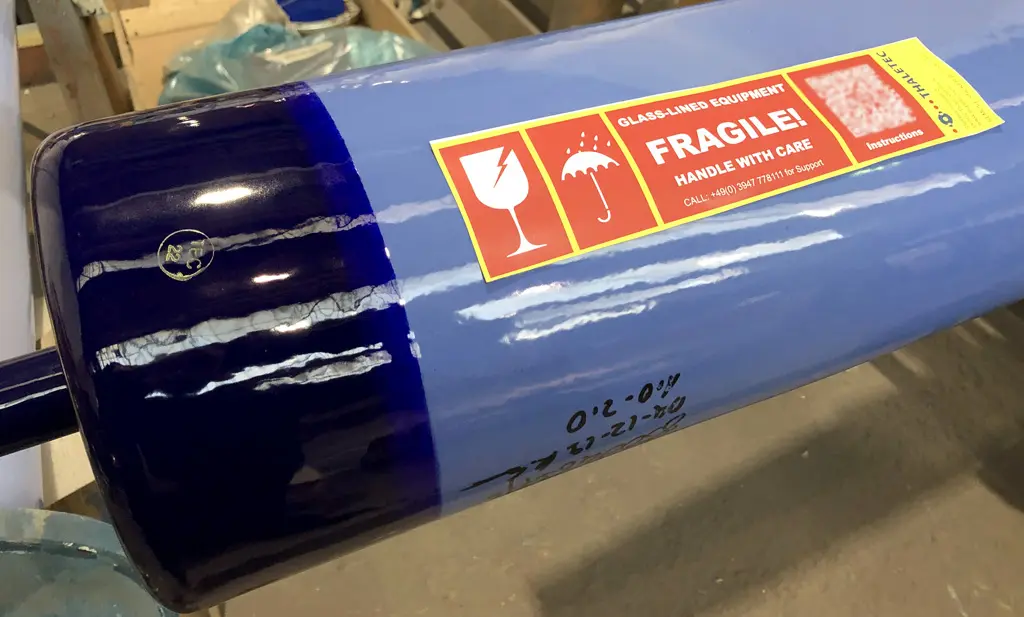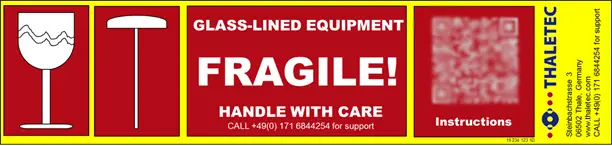 Daher hat THALETEC in enger Abstimmung mit Kunden aus der chemischen und pharmazeutischen Industrie ein Kennzeichnungskonzept entwickelt: Alle emaillierten Bauteile von THALETEC werden daher zukünftig mit entsprechenden Aufklebern gekennzeichnet, um auf die Notwendigkeit einer „schonenden“ Handhabung emaillierter Bauteile hinzuweisen.