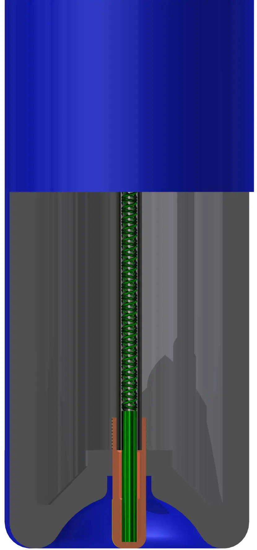 Um die Temperaturmessspitze besser gegen Verschleiß durch von der Seite anströmenden, gegebenenfalls feststoffbeladenen Flüssigkeiten zu schützen, wurde das untere Ende der ARB Stromstörer konkav gestaltet (siehe Abbildung oben). Im Zentrum der Kugelfläche befindet sich, vor dem direkten Anströmen geschützt, die Temperaturmessspitze für die flexsens Sonde.