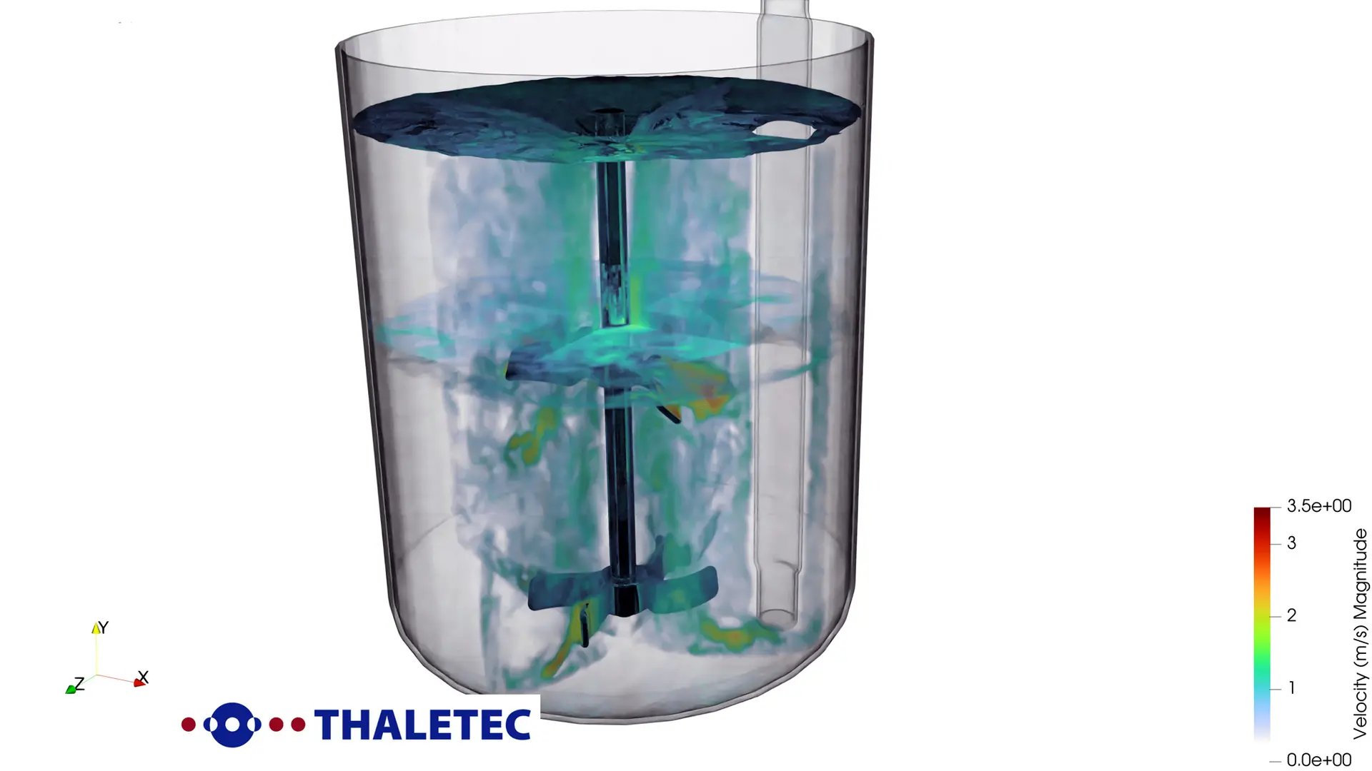 Alle weiteren Aspekte, wie die Turbinengeometrie und -anzahl sowie die Stromstörerart und -anzahl sowie der Bodenabstand werden durch die dimensionslose Newtonzahl abgebildet, welche experimentell oder mit Hilfe von CFD (Computerized Fluid Dynamics) ermittelt werden kann (Abbildung 2). Hier kann auf das Knowhow von THALETEC zurückgegriffen werden und Kenndaten, wie der Leistungseintrag, das Wellendrehmoment, der spezifische Leistungseintrag oder auch die kritische Suspendierdrehzahl sowie die Umwälzleistung und -zeit, der kundenspezifischen Rührtechnik ermittelt bzw. berechnet werden.
