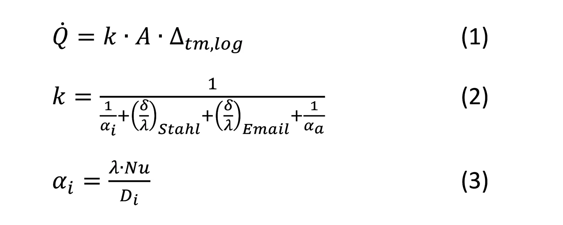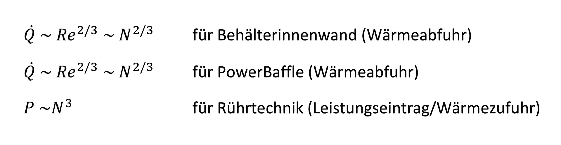 Der Wärmedurchgangskoeffizient ist abhängig von der Wandstärke der Stahlwandung und der Emailschichtdicke sowie deren Wärmeleitfähigkeiten. Weiterhin ist fachspezifisches Knowhow zur Bestimmung der Wärmeübergangskoeffizienten (3) notwendig. Dieser ist hinsichtlich der Behälterinnenseite (i) von geometrischen und stofflichen Parametern sowie der Rührtechnik bzw. den Strömungsverhältnissen abhängig. Diese Einflussgrößen werden von der Nusselt-Zahl (Nu) wiedergegeben und spiegeln firmeninternes Wissen wider. Der Wärmeübergangskoeffizient (a) an der Behälteraußenseite (Doppelmantel/Halbrohrschlange) bzw. der Rohrinnenseite des PowerBaffle ist hinreichend aus der Literatur bekannt, beinhaltet jedoch ebenso empirische und dimensionslose Kennzahlen.