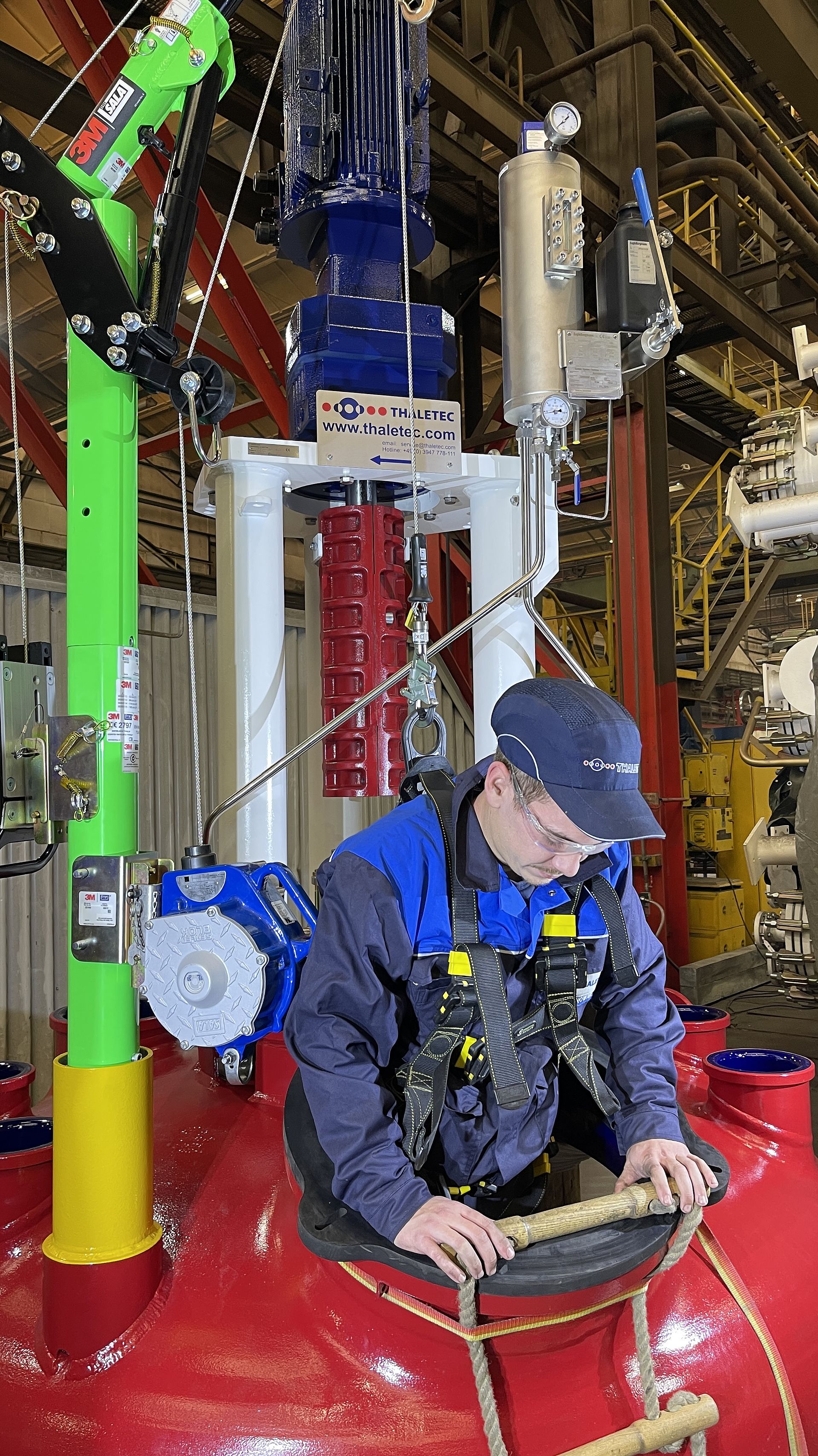 Für das marktführende 3M™ DBI-SALA® Modulare Davit-Hebesystem „HC“ (klein oder groß) hat THALETEC nun eine standardisierte Montagebasis, die THALETEC SafeBase, entwickelt. Sie ist gemäß den relevanten Normen und Anforderungen gefertigt und kann bei neu anzufertigenden Apparaten oder im Rahmen einer Reemaillierung auf dem oberen Boden in der Nähe der Mannlochöffnung angebracht werden. Der Platzbedarf einer THALETEC SafeBase entspricht etwa einem Behälterstutzen DN 100 (4‘‘).
